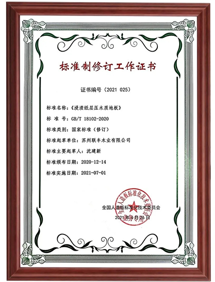 作為標準化示范企業(yè),聯(lián)豐一直對企業(yè)標準的制定極為重視,尤其在技術(shù)、服務(wù)、業(yè)態(tài)不斷更新迭代的當下,聯(lián)豐認為高標準的制定將極大地推進地板產(chǎn)業(yè)的高質(zhì)量成長。在蓬勃發(fā)展的十多年里,聯(lián)豐用實際行動積極參與制定、修訂實木地板、強化地板、地采暖木質(zhì)地板、高耐磨漆飾實木地板等國家標準,地采暖用實木地板鋪裝、驗收規(guī)范,負氧離子木地板等行業(yè)標準,為中國地板行業(yè)的標準化、制度化建設(shè)貢獻力量,推動行業(yè)高質(zhì)量發(fā)展。