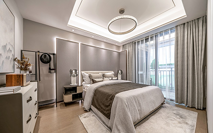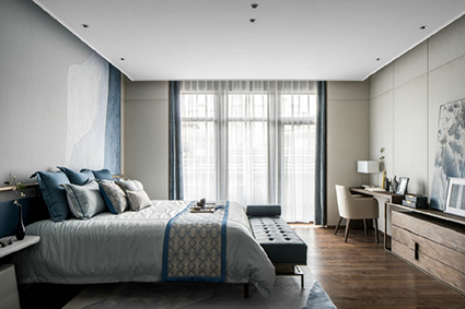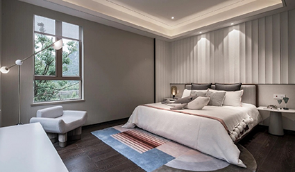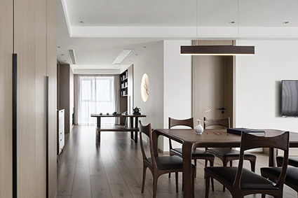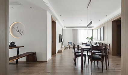 原木色空間十分貼合新中式的“刪繁就簡”的特點,木材原生的肌理與色彩展現(xiàn)自然與舒適,與原木色略帶節(jié)疤效果的地板和線條簡約的家居搭配,輕松營造出自然愜意、受文藝青年喜愛的禪意效果。