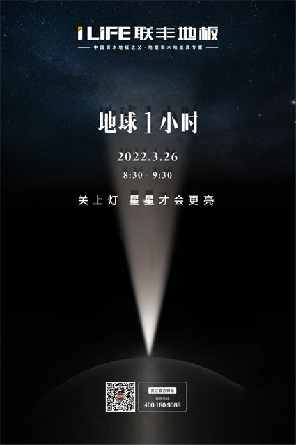 聯(lián)豐地板與全世界共同踐行“相約2030:萬象更新,回歸自然”的十年環(huán)保承諾,助力“地球一小時”,全國1000間門店將同時關閉非必要光源,以熄燈的行動踐行環(huán)保理念。