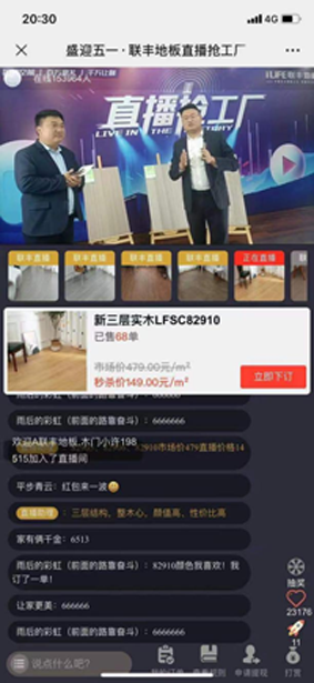 在直播間開場不斷攀升的人氣中,聯(lián)豐木業(yè)總經(jīng)理李玉明首先致辭,他指出,從2020年開始,疫情下的聯(lián)豐就持續(xù)深耕數(shù)字化用戶運營系統(tǒng),加速推進數(shù)字化營銷步伐,不僅為品牌注入活力,更為終端帶去新的契機,打造新的流量入口,實現(xiàn)線上線下無縫對接。今晚的活動,李總更是為直播間的十多萬老鐵送出了鄭重承諾和巨大福利:總部操盤,省心更舒心,全場均為工廠直供價;質(zhì)量保證,稱心更安心,本次活動銷售的所有產(chǎn)品均為本廠生產(chǎn),拒絕貼牌,產(chǎn)品質(zhì)量可控,均符合及優(yōu)于國家標(biāo)準(zhǔn),執(zhí)行“質(zhì)保20年”服務(wù)承諾;無憂下訂,開心更放心,無購物抽獎不定時大奉送。