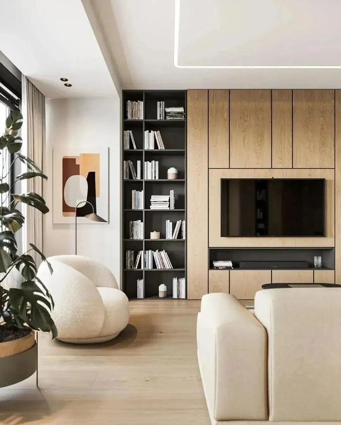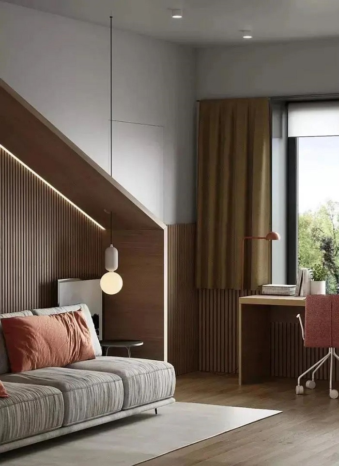 簡約灰白與原木色聯(lián)豐與之呼應(yīng)呈現(xiàn)出高級(jí)感,線條感貫穿在墻壁、書架之間的設(shè)計(jì),搭配著春日生機(jī)昂揚(yáng)的綠植,形成另一番愜意之感。