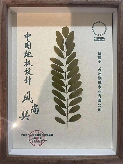 聯(lián)豐地板憑借持續(xù)領(lǐng)先的設(shè)計(jì)理念與卓越的產(chǎn)品力量,成功演繹高品質(zhì)的自然風(fēng)地板, 榮獲“中國地板設(shè)計(jì)風(fēng)尚獎”,為行業(yè)進(jìn)步做出突出貢獻(xiàn)。