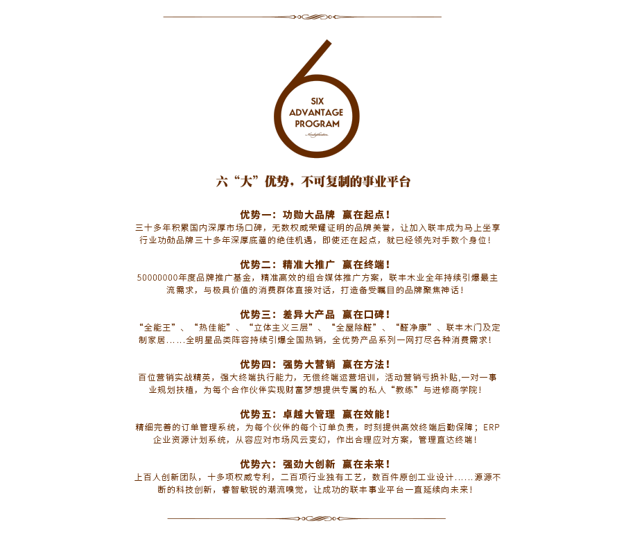 聯(lián)豐公司負(fù)責(zé)全國(guó)性的廣告宣傳,包括電視、報(bào)紙、雜志、路牌、燈箱、公益贊助等、同時(shí)經(jīng)公司總部批準(zhǔn)投入的區(qū)域性廣告,公司可承擔(dān)部分費(fèi)用。